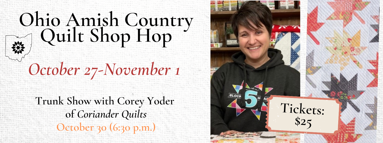 Join us as we celebrate our 25th anniversary event! Begin by grabbing your passport at any of the participating stores. Take a drive through the beautiful countryside as you explore each destination to collect your free block pattern, view 12 exclusive quilts, and shop. At your final stop, you will turn in your completed passport for a chance to win prizes!